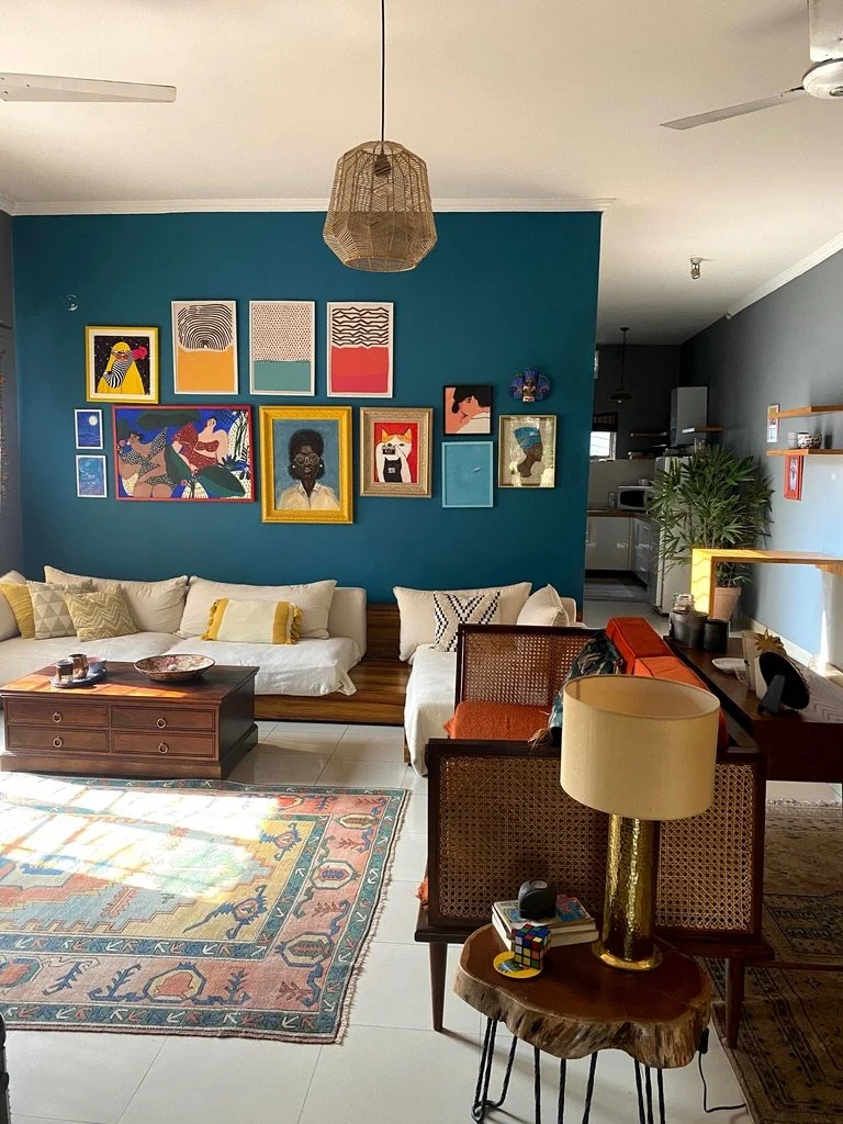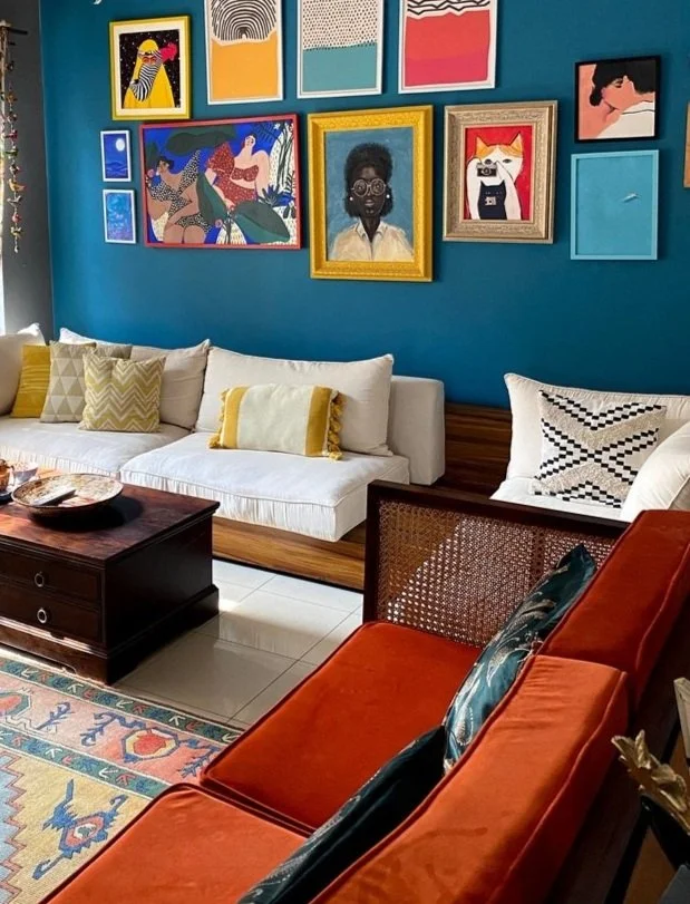 Instead of sticking to one style - like mid-century, MCM, boho, industrial - I wanted to use a bit of all of them so it doesn’t feel..predictable and boring. We incorporated a lot of fun art from local designers and artists which organically formed a gallery wall on the teal backdrop and with it, mixed in some traditional furniture pieces (coffee table), some mid-century ones (TV Console) with some trendy colored pieces (heirloom cabinet) and some modern (the sofa).