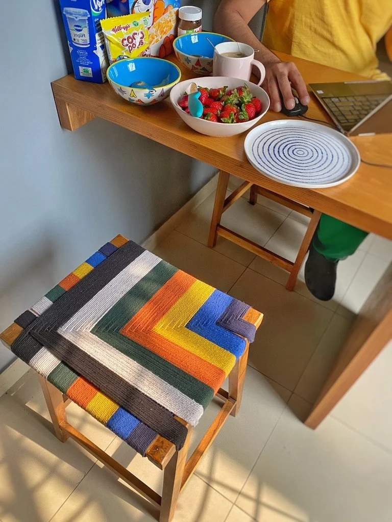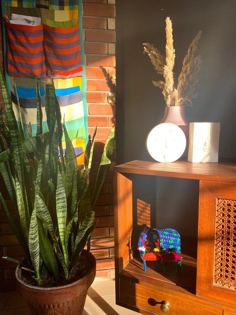 Adding pops of color in unexpected places can create an element of surprise and unpredictability in the room. Don’t we all love that? For instance, this colorful handwoven and handmade organizer against a brick wall.